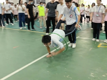 活动的第一项挑战是“负重向前冲”。将呼啦圈套在腰上,不使用手固定的情况下,成功带着呼啦圈跑到对面,交给下一位同学,如此交替进行,直到所有成员都完成即为挑战成功。活动中,同学们各出奇招、花样百出,有高抬腿的,有单脚跳的,有扭腰旋转的......大家玩得不亦乐乎,部分老师也加入到活动中。